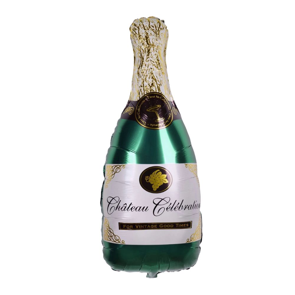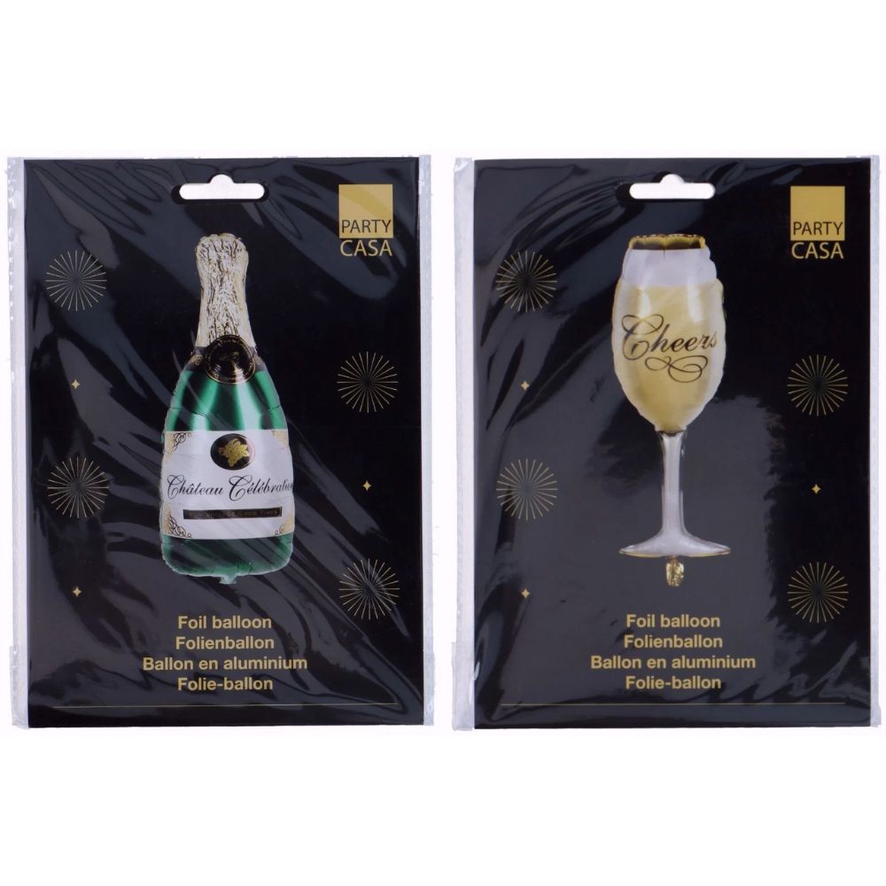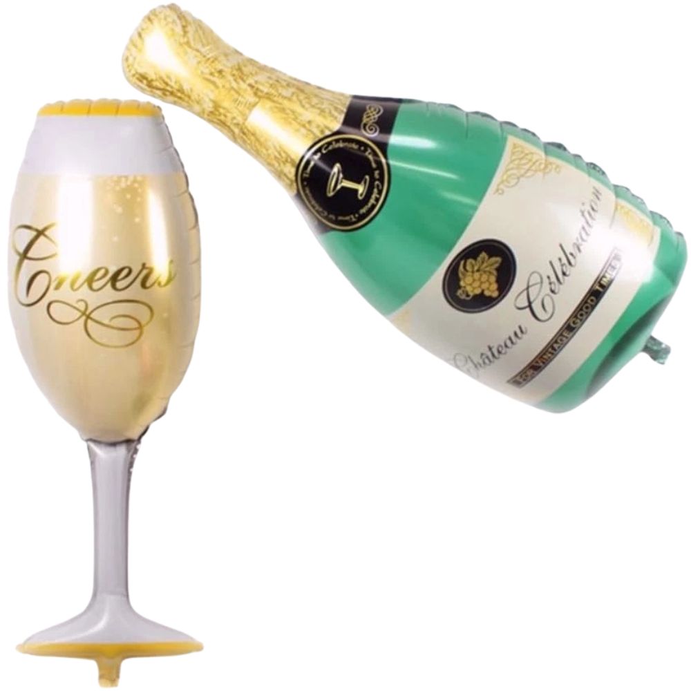 Champagne bottle balloon measures approximately 82 cm (height) x 33 cm (width), and the glass balloon is around 77 cm (height) x 28 cm (width), making them bold statement pieces at your party.