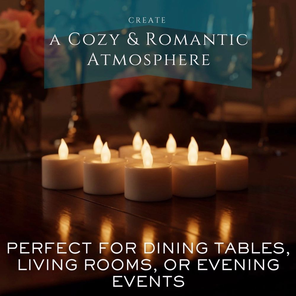 PACK OF 24 TEA LIGHTS – Includes 24 white LED candles with batteries (CR2032 included) for instant use.
