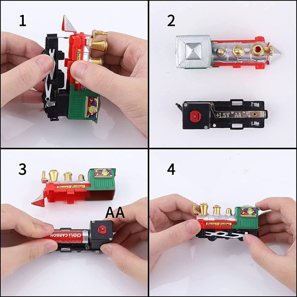 - Have fun with the Christmas train toy: install the rails on a flat floor or table after you receive the Christmas tree train set. Make sure that the steps are correct as an instruction. Then charge 1 x AA battery (not included) into the freight trolley. It can run very quietly on the track.