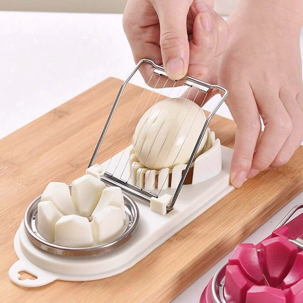 2-IN-1 DESIGN: Functions as both an egg cutter and a slicer, ideal for slicing boiled eggs, strawberries, mushrooms, kiwis, and more.